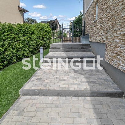 Три формата камней позволяют уйти от рутинной прямоугольной укладки. Поверхность получается равномерной и устойчивой — благодаря минифаске и боковым рустам. Плитка легко укладывается вручную и не требует специального оборудования.